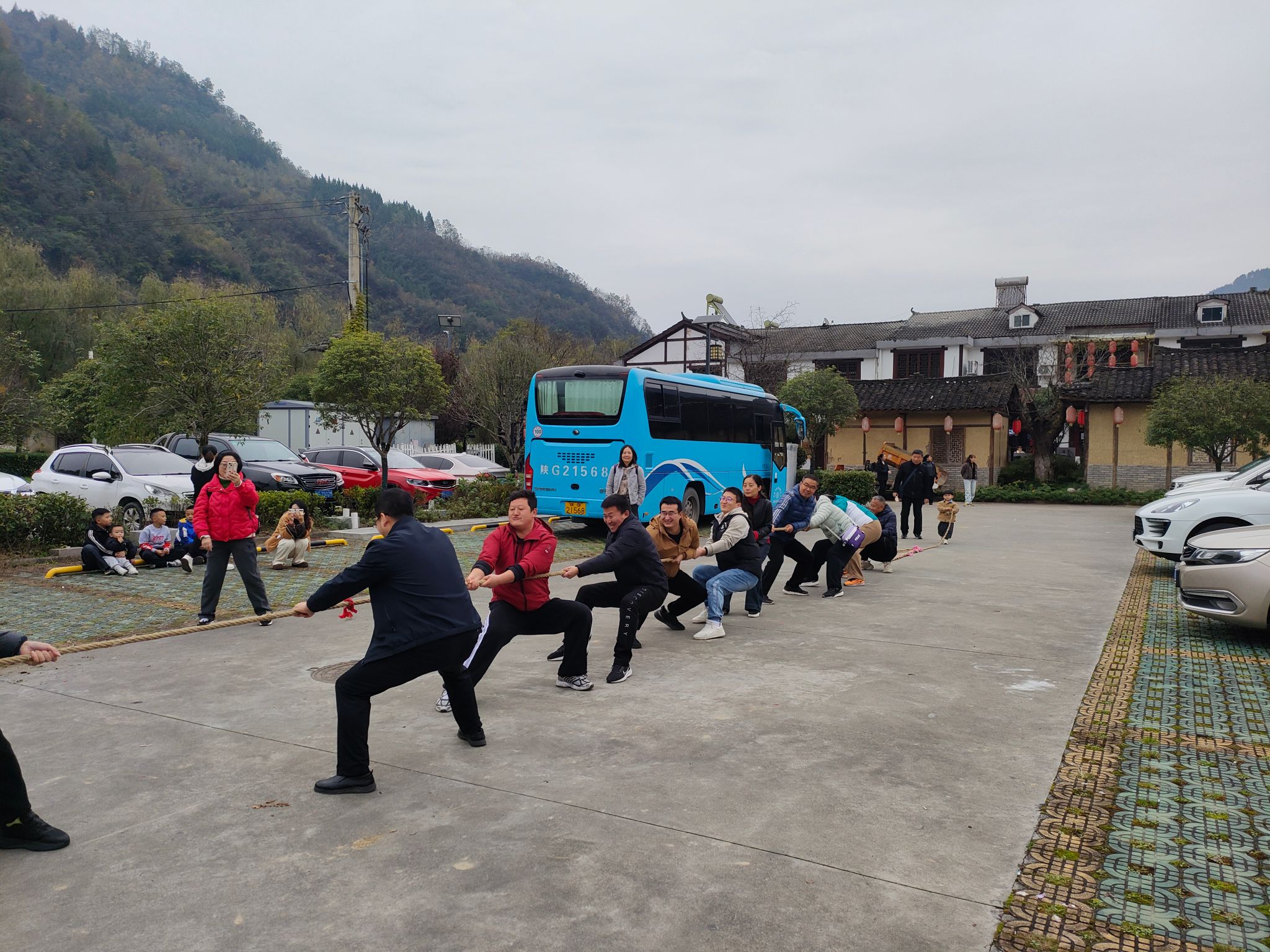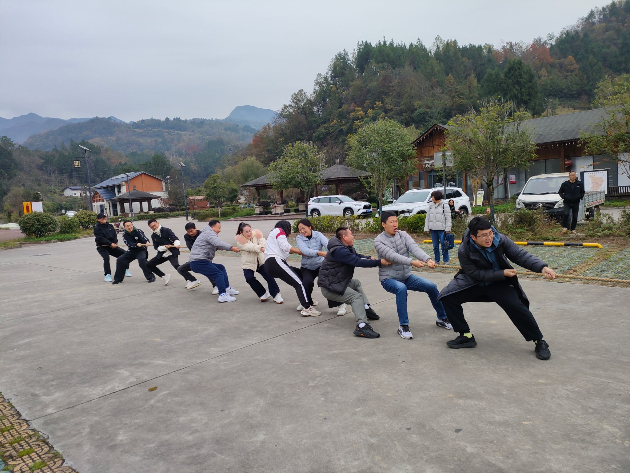 随后,在小镇空地上展开了一场充满活力的拔河比赛,赛场上,队员们齐心协力、奋力拼搏;赛场边,啦啦队的呐喊助威声此起彼伏。比赛既紧张激烈又欢乐和谐,充分展现出bwin教职工团结协作、奋发向上的精神风貌。