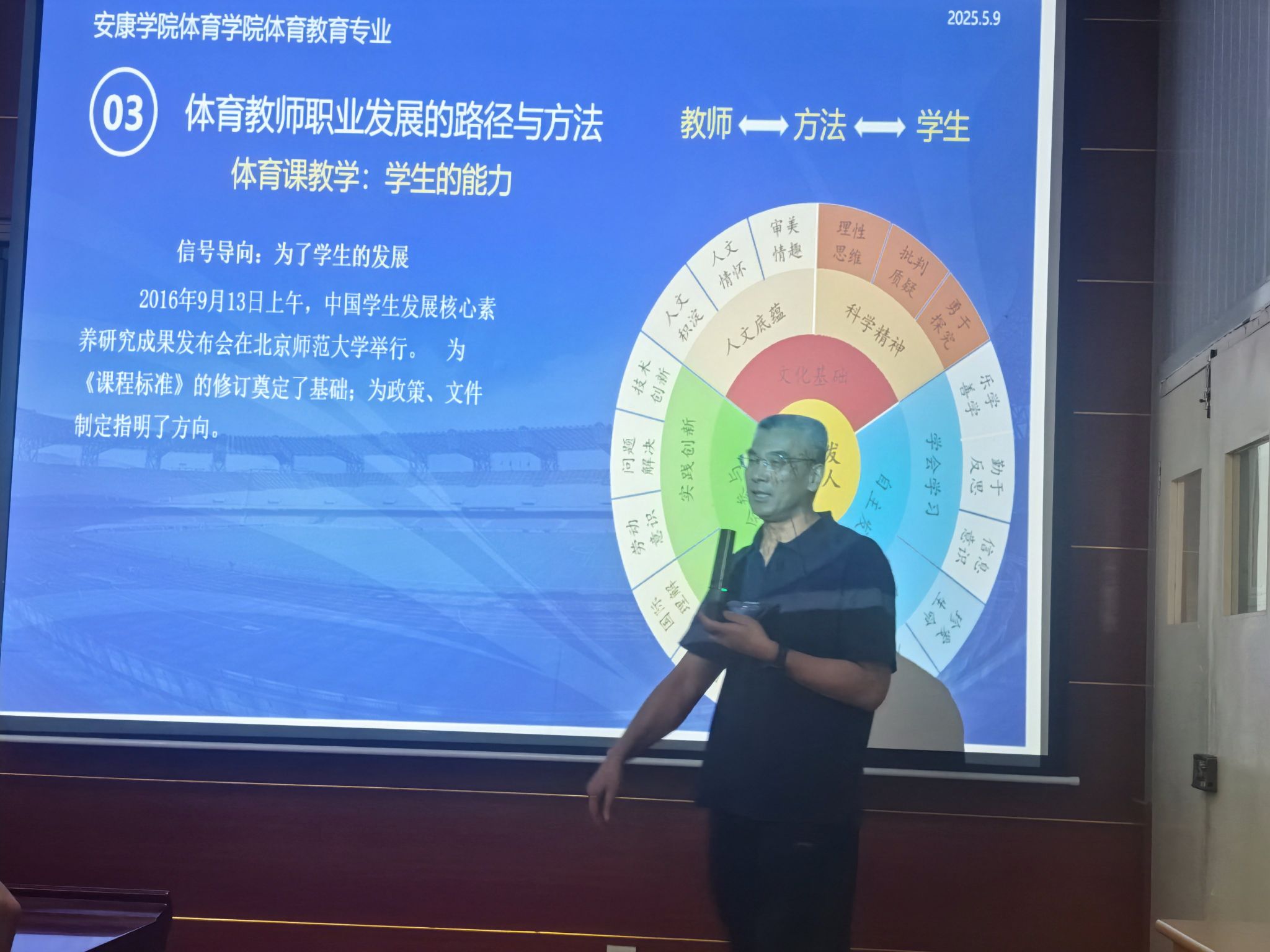 杜泉老师从政策导向、职业发展与教学实践三个层面展开讲解。他结合国家体育教育改革方向,指出体育教师需适应“健康第一”的教育理念,注重学生全面发展。在职业发展方面,他提出“多元能力提升”与“终身学习”的路径,鼓励教师通过跨学科学习与数字化技能拓展专业边界。