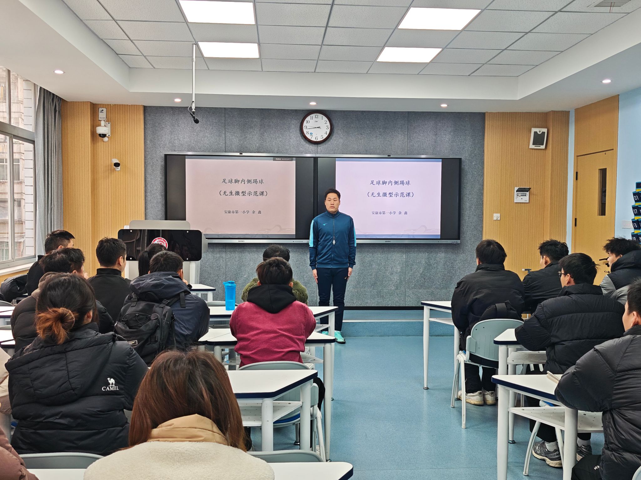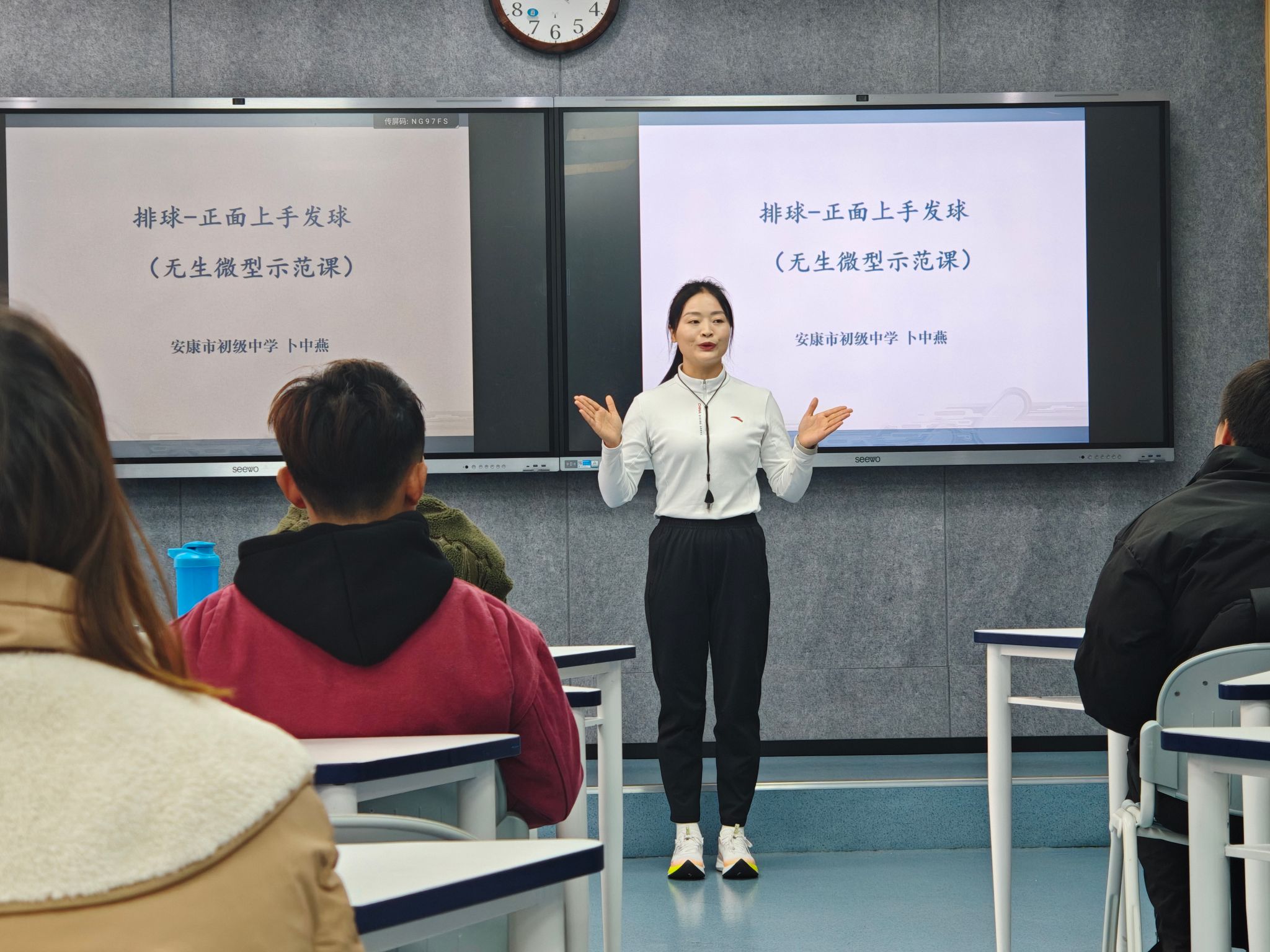 活动伊始,余鑫老师以小学体育课程中经典的“足球脚内侧踢球”为教学内容,通过游戏化、情境化的教学设计,生动演示了如何激发小学生的运动兴趣,展现了小学体育课堂寓教于乐的鲜明特色。紧接着,卜中燕老师围绕“排球正面上手发球”这一技术难点,进行了一场严谨规范的中学教学示范,其清晰的讲解要领和准确的动作分解,充分体现了中学体育教学对专业性的高标准要求。