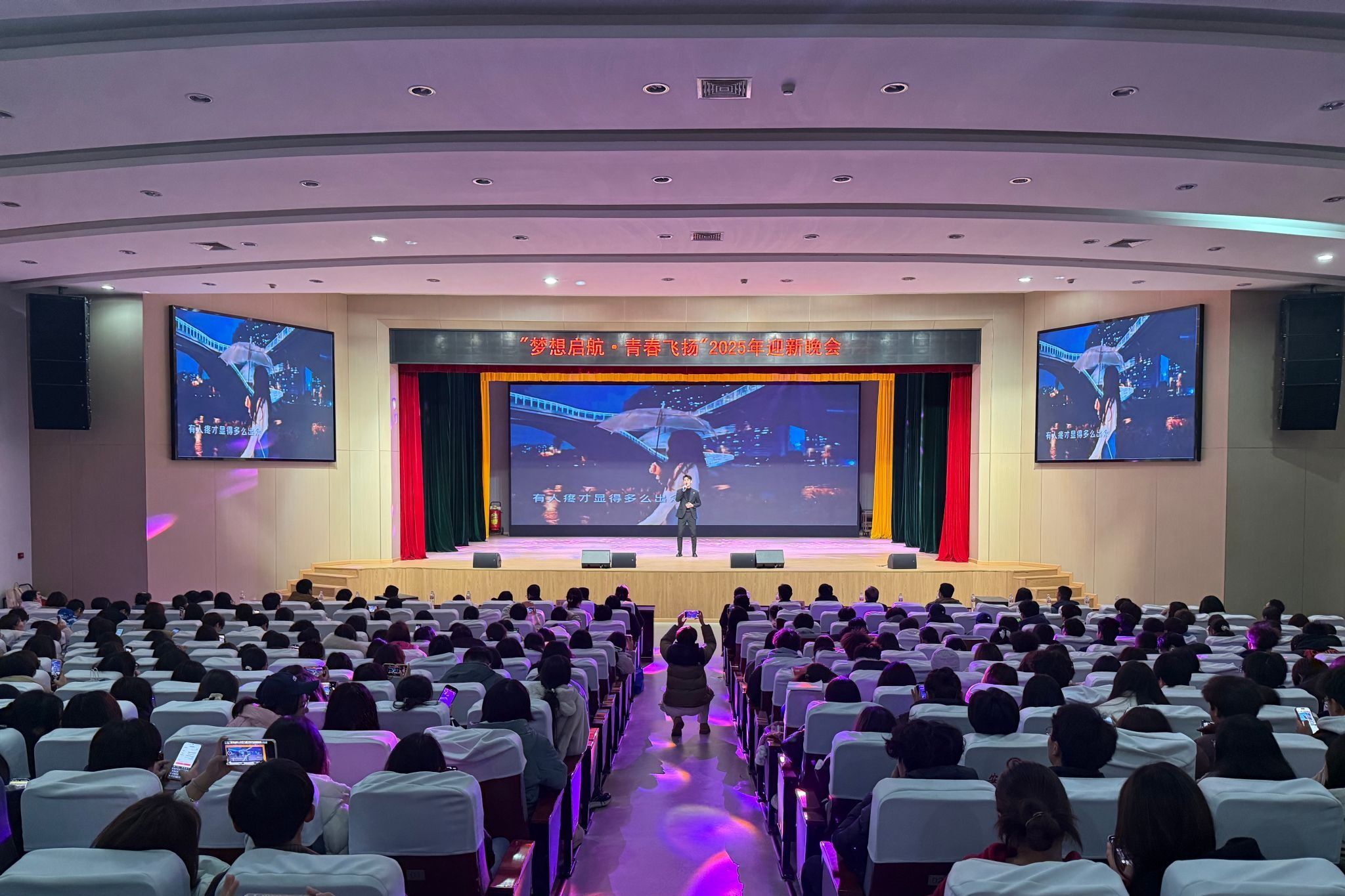 12月14日晚,江南大礼堂内星光璀璨,气氛热烈非凡,bwin与文传学院联合举办的“梦想起航 青春飞扬”2025年迎新晚会如期举行。党委组织部部长谢军、学工部部长芦伟、团委书记周云、副书记陈瑶,bwin和文传学院领导班子、辅导员(班主任)老师与两院全体2025级新同学欢聚一堂,共同迎接崭新的大学生活,展望美好未来。