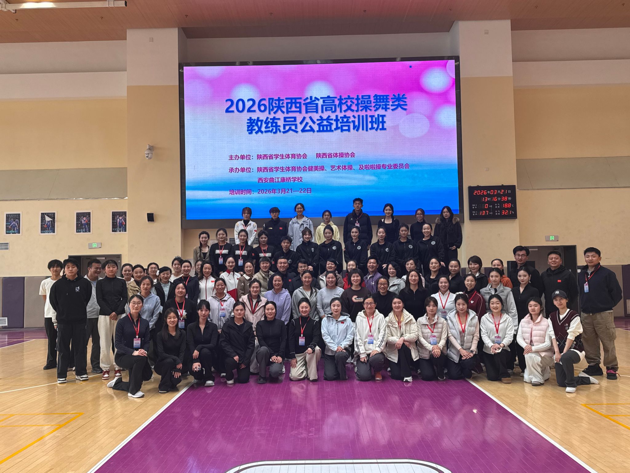 为深入贯彻"健康第一"教育理念,深化体教融合,强化高校操舞类教练员队伍专业化建设,3月21日—22日,2026年陕西省高校操舞类教练员公益培训班在西安曲江康桥国际学校成功举办。bwin青年教师邢轩硕、关惠尹带领6名健美操队队员参加了本次培训。